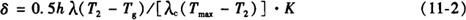 式中 δ——保温材料的厚度(m); h——混凝土结构的厚度(m); λ——保温材料的导热系数[W/(m·K)],不同保温材料的λ值见表11-9; λc——混凝土的导热系数[可取2.3W/(m·K)]; T2——混凝土的表面温度(℃); Tmax——混凝土的最高温度(℃); Tg——混凝土达到Tmax(浇筑后3~5d)时的大气平均温度(℃); K——传热系数的修正值,K值见表11-10。 表11-9 各种保温材料的导热系数λ值