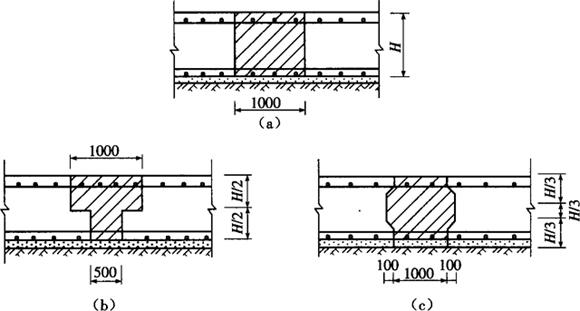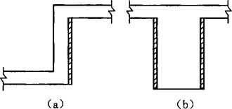 图11-17 缓冲层示意图 (a)高、低底板交接处;(b)底板地梁处 6.设置应力缓和沟 设置应力缓和沟,这是日本清水建筑工程公司研究成功的一种防止大体积混凝土开裂的新方法,即在混凝土结构的表面,每隔一定距离(结构厚度的1/5)设置一条沟。设置应力缓和沟后,可将结构表面的拉应力减少20%~50%,能有效地防止表面裂缝。我国已用于直径60m、底板厚3.5~5.0m、容量1.6m3的地下罐工程,并取得良好效果。应力缓和沟的形式,如图11-18所示。