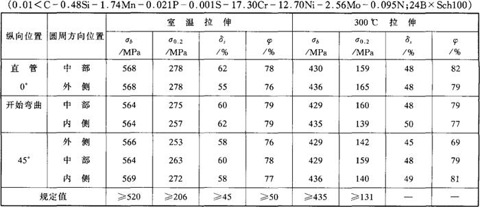 注:①300℃的力学性能指标。 表1-168 控氮00Cr17Ni12Mo2钢管(Φ310×24mm)的室温力学性能