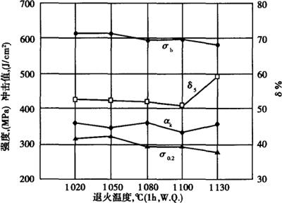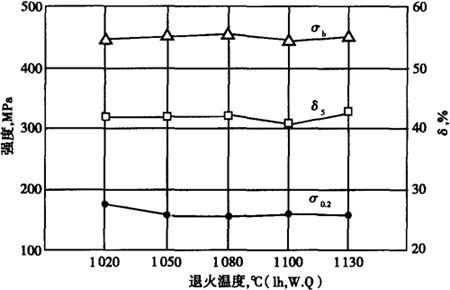 钢的固溶处理温度与室温和350℃的力学性能之间的关系见图1-200和图1-201。