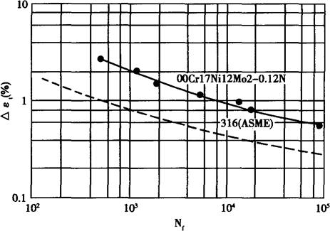 图1-202 控氮00Cr17Ni12Mo2钢的低周疲劳曲线性 (固溶状态,试样M12mm×100mm,GB6399-86)