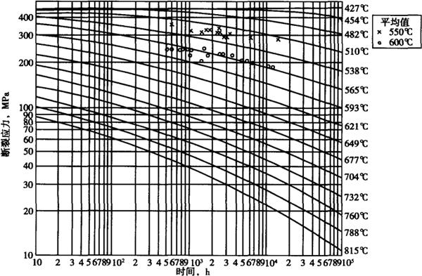 图1-203 控氮00Cr17Ni12Mo2钢的疲劳裂纹扩展速率 (固溶态,试样为100×96×20mm) LogC=-12.08,n=4.16,da/dN=C(△K)n=8.317×10-13(△K)4.16 断裂韧性采用J积分积确定,试样尺寸为14mm×28mm×130mm,中间线切割并开疲劳裂纹,其值为:J1C=885.4kN/m K1C=421.3MPam1/2(由 (5)持久性能 控氮00Cr17Ni12Mo2的550℃和600℃和600℃的持久强度优于ASME规范中的00Cr17Ni12Mo2,见图1-204。