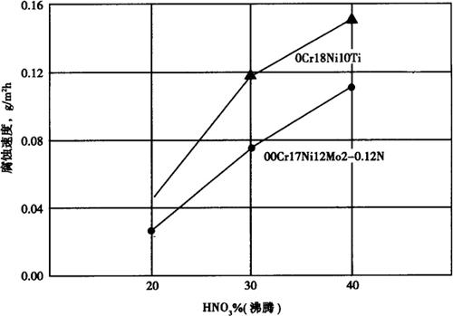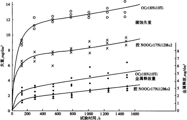 图1-204 控氮00Cr17Ni12Mo2钢的持久强度 (与Code Case 1592ASME比较) (6)耐蚀性 a.均匀腐蚀 钢的耐均匀腐蚀性能优于非控氮的00Cr17Ni14Mo2,在硝酸中的耐蚀性见图1-205。其腐蚀率明显优于0Cr18Ni10Ti。在1NH2SO4中的极化行为见图1-206。该钢较00Cr17Ni12Mo2易于钝化,在反应堆高温高压水环境中的腐蚀量与金属释放量与试验时间的关系曲线见图1-207。