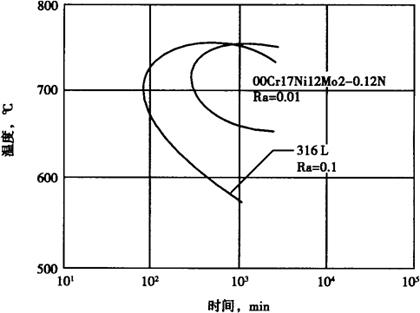 图1-207 在高温高压水中00Cr17Ni12Mo2的腐蚀 (静态高温中性高纯去离子水,pH=7±0.2,电导率<1μs/cm2,O2≤0.1mg/L,试验温度为265℃±1℃,试验7个周期共1507h,每周期更新介质,试验后用APAC法脱膜) b.敏化和晶间腐蚀 控氮00Cr17Ni12Mo2钢具有极好的抵抗敏化能力和耐晶间腐蚀性能,即便是长时间敏化处理(700℃×100h)其再活化率Ra值也达不到10%,而00Cr17Ni12Mo2(316L)仅经700℃×2h敏化,再活率就能达到10%,其TTS见图1-208。