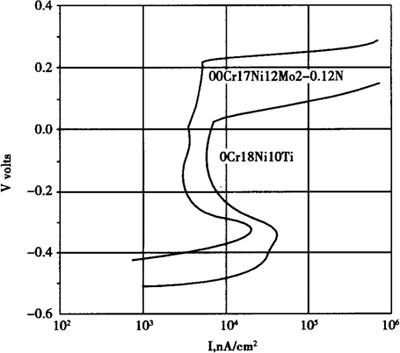 图1-206 控氮00Cr17Ni12Mo2钢在30℃,1NH2SO4中的极化曲线