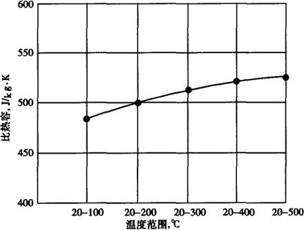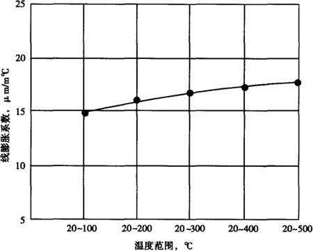 (7)工艺性能 控氮00Cr17Ni12Mo2钢的工艺性能类似于00Cr17Ni14Mo2和00Cr17Ni14Mo2钢,生产板、管、丝带等冶金产品无特殊困难。推荐的热加工温度范围为1000~1250℃。 钢的热处理固溶温度范围较宽,在1020~1130℃之间均可,可根据材料截面尺寸和品种进行选择。 控氮00Cr17Ni12Mo2钢焊接性能良好,一些焊接参数可参照00Cr17Ni14Mo2。手工钨极氩弧焊焊丝推荐采用H00Cr17Ni12Mo2,手工电弧焊焊条为CHS022NG。 (8)物理性能 比重:8.04。 线膨胀系数、弹性模量、切变模量、泊桑比、导热系数、比热的数据见图1-210至图1-213。