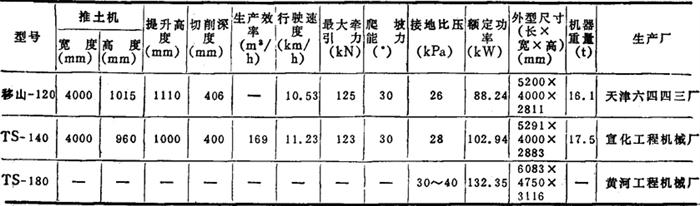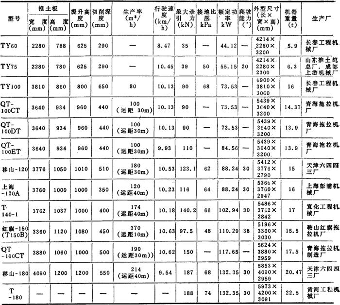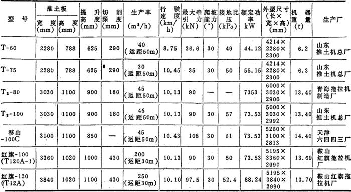 (二)履带式机械传动液压操纵推土机 功率大小不一,结构形式也不相同。功率小的多用于修筑道路和货站场地等。功率较大的适于矿山、水电、大型土石方工程的铲推运料等作业。其技术性能见表2-8-61。 表2-8-61 履带式机械传动、液压操作推土机性能