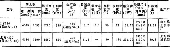 (三)履带式液力机械传动推土机 TY220和上海-320型,都是引进的国外技术制造的。该机均配有进口的技术先进的发动机。采用了液力变矩器和动力换档变速箱、浮动油封、密封履带等先进技术。适用于矿山、水电、筑路、城建等大型土方工程。其技术性能见表2-8-62。 表2-8-62 履带式液力机械传动推土机技术性能