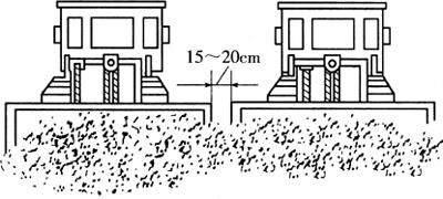 图1-11 推土机槽式推土法 (三)并列推土法 当平整场地的面积较大时,可用2~3台同类型推土机同步并列推土作业,铲刀相距15~20cm。这样可以减少土的散失,增大推土量15%~30%(图1-12)。但平均运距不宜超过70m,也不宜小于20m。并列推土一般不宜超过3台推土机,否则会造成行驶不一致反而影响生产效率。