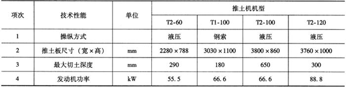 图1-12 推土机并列推土法 并列推土法要求驾驶员的操作技术非常熟练,作业时注意相邻推土机的行进速度和方向,既要保持同步前进,又要避免相互影响。 在建筑工程中常用的推土机机型主要有:T2-60、T1-100、T2-100和T2-120等,它们的主要技术性能如表1-8所示。 表1-8 常用推土机的主要技术性能