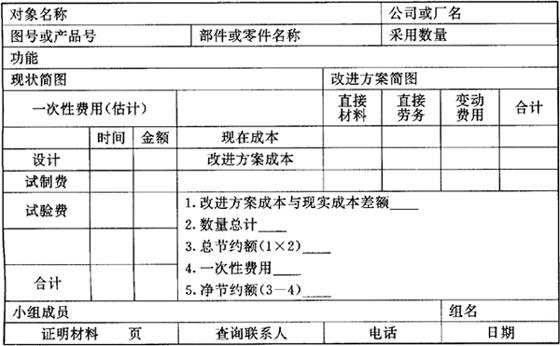 提案通常是写成表格的形式,有一项改进意见就填一张如表2.6.11-1的价值分析提案表,最后汇总成表2.6.11-2的提案总表。