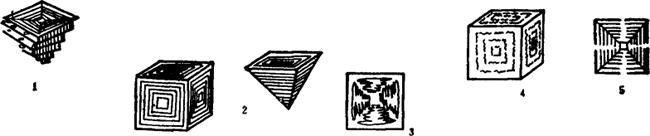 图2-9-1 生物对氯化钠晶体形成过程的影响 1-不规则的正六面体 2-骸晶与漏斗晶 3-晶体内部波纹状和气泡 4-晶体不透明呈乳白色 5-晶体内部向一侧生长