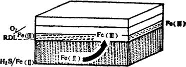 图2-9-2 利用卤虫澄清卤水 3.降低卤水中的SO42- 由于硫磺还原细菌分解藻垫层底部的有机质,可造成一种厌气微环境,产生硫化氢(H2S)气体。卤水中硫细菌具有吞食卤水中SO42-的能力,从而降低卤水中SO42-的含量,使析出的盐质量提高。 4.排除铁(Fe)和还原的黑色泥土 铁在氧化还原界面下,由于还原性环境的作用,常以Fe2+作为FeS或FeCO3形式存在。在氧化还原界面上,则以不溶性的三价氢氧化铁〔Fe(OH)3〕或三氧化二铁(Fe2O3)沉淀。由于孔隙水的作用和扩散作用,二价铁离子向上移动(图2-9-3)。在这种微环境中,氧化还原的梯度很高,间断层(RDL)上下还原电位(Eh)相差可达500mV以上。