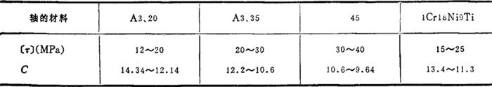 C——随材料许用扭转应力〔τ〕变化的系数,其值见表3-5-7。 表3-5-7 常用轴材料的〔τ〕及C值