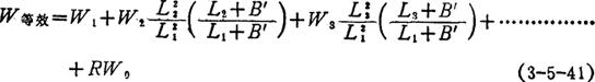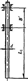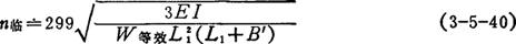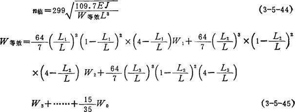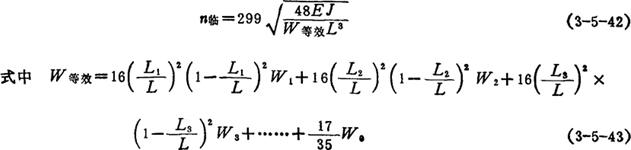 图3-5-18 搅拌轴临界转速计算简图 B′-轴的支承距离(cm) L1-轴外伸端距离(cm) L2L3-各搅拌器外伸端距离;(cm) W0-外伸端轴的重量,(kg) m0-外伸端轴的质量(kg·s/cm),m0= 式中 n临——轴的临界转速(r/min); E——轴的材料弹性模数(kgf/cm2),对碳钢,E=2.1×106kgf/cm2 I——轴的惯性矩(cm4),对实心圆轴,I= W等效——轴及搅拌器的等效重量(kg)