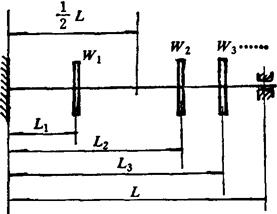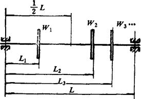 图3-5-19 搅拌轴临界转速计算简图 L1、L2、L3-各搅拌器距支承点距离(cm) W0-两支点距离L段轴的重量(kg) W1、W2、W2-各搅拌器的重量(kg)
