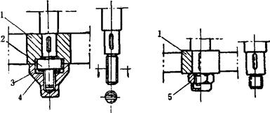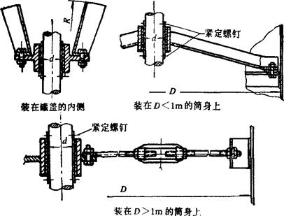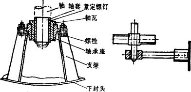 图3-5-23 底轴承结构图 5.搅拌轴同搅拌器的连接 (1)搅拌器与轴的连接 将桨叶一端煨成半个轴套,用螺栓将对开的轴套夹紧于搅拌轴上(见图3-5-16),一般用于桨式搅拌器。当D≤0.6m时,用一对螺栓销紧;D≥0.7m时,用两对螺栓销紧。为传递扭矩可靠起见,常用穿轴螺栓使搅拌器与轴固定。 (2)搅拌器与轴的连接 用键和止动螺钉将搅拌器轴套固定在搅拌器轴上。搅拌器轴套外径宜为轴径的1.6~2倍,轴套长度应略大于轴套处搅拌叶宽度在轴线上的投影长度,且不小于轴径。对于较大的搅拌器和轴的连接,可采用图3-5-24结构型式。其优点在于:①连接牢固;②比穿孔对夹的轴强度高;③能防止螺纹生锈。