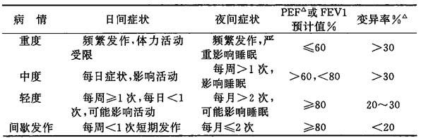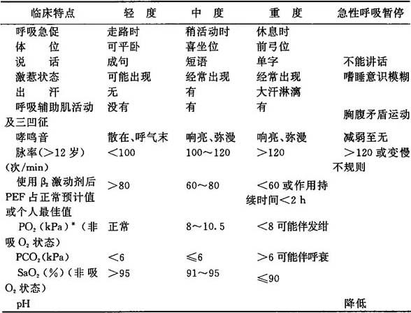 (2)急性发作期 严重度评价:气促、咳嗽、胸闷等症状突然发生,常伴呼吸困难、呼气流量降低,程度轻重不一,可在数小时或数天内病情加重,偶也可在数分钟内即发生呼吸衰竭而危及生命,详见表9-3。 表9-3 哮喘急性发作期严重度评价