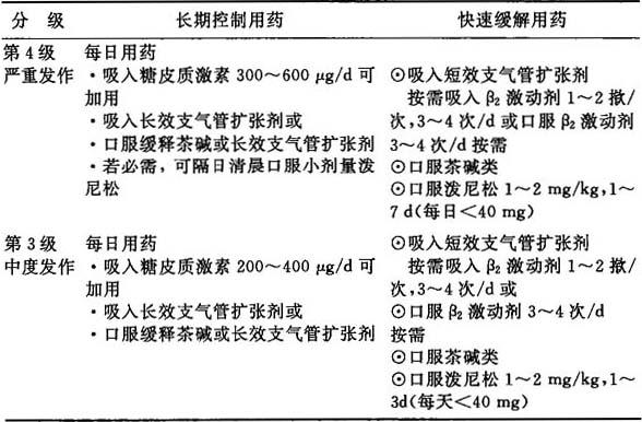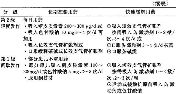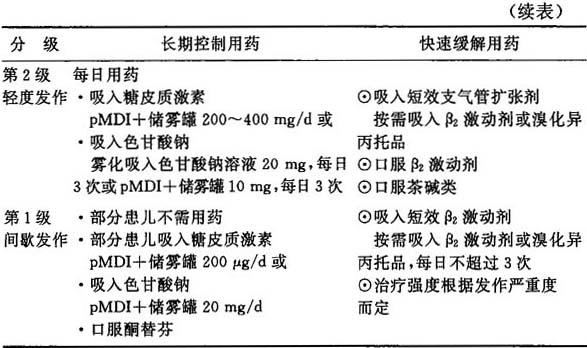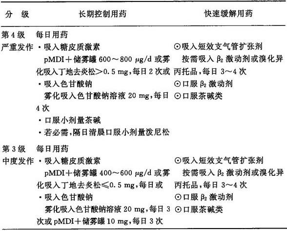 *每1~3个月审核一次,若哮喘控制至少以达3个月已逐步降级治疗,未控制,升级治疗,但需先审查用药技术及依从性,注意避免和控制变应原和触发因素。吸入维持量皮质激素至少6个月~2年。 4.儿童治疗方案 儿童哮喘长期治疗方案,见表9-5。 表9-5 儿童(≥3岁)哮喘长期预防方案*