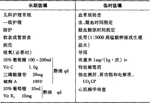 说明:1.氟乙酸钠或氟乙酰胺中毒者用乙酰胺解毒,剂量0.1~0.3g/(kg·d)im bid×(5~7)d。 2.抽搐时可用苯巴比妥止痉,休克时可用多巴胺升压,呼吸困难时可行气管插管,并护脑治疗。 3.出血量多时可输新鲜血。 4.注意防治肾衰竭。 5.毒鼠磷、除鼠磷中毒者,应及早用阿托品及解磷定(用法同有机磷中毒)。 |