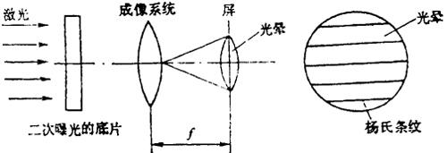 图3.3-5 散斑的形成 如果用同一底片对物体形变前后的两种状态进行两次曝光时,就能得到两组散斑的叠加,形成带有位移信息的散斑图。当把散斑图作图3.3-6的处理,则在屏上可以看到杨氏干涉条纹;如果物面变形成两维情况时干涉条纹就呈等高线形状,这就是散斑的干涉。完成散斑干涉的方法有:参考光法、双光束法、双孔径法等。