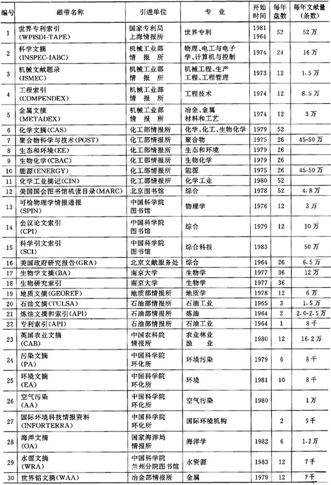 目前我国的主要数据库为文献题录数据库。文献题录数据库有从国外引进的磁带文档和自建的磁带文档。目前我国引进的文献磁带共有30多种,这些磁带文档主要是美国和英国生产的。专业包括自然科学和技术科学各个领域。每年约有600多盘磁带,包括文献每年约250万条。自建磁带文档较少,多为试验性的。如中国科学院图书馆曾自建激光文献磁带10000条,航空工业部132厂用汉语拼音建立航空工业国内文献15000条磁带文档,中国科技情报所和国家医药总局正在建立汉字中草药数据库,中国科学院环化所正在建立汉字环境化学数据库。这些数据库已累积数万条文献。