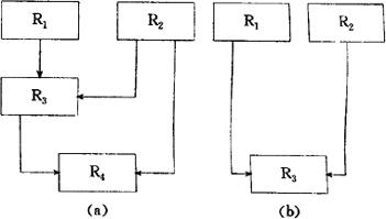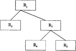 图5.1.4-2 一个企业的组织机构 (1)有且仅有一个结点无双亲,这个结点即为树的根,称为根结点; (2)其它结点有且仅有一个双亲。 凡满足上面两个条件的“基本层次联系”的集合,就称为层次模型。在层次模型中,同一个双亲的结点称为兄弟。 如图5.1.4-3示出的树结构中,R1是根,R2,R3同是R1的子女,因此R2,R3是兄弟。R2,R4,R5都是无子女的结点,称为叶子。