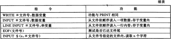 使用顺序文件的步骤如下: (1)使用OPEN语句,将文件名与文件号联系起来,其中存取模式这一项,可以选用如下三种之一: ①OUTPUT——输出型文件,用于向磁盘写出数据。 ②INPUT——输入型文件,打开磁盘文件用于读入数据。 ③APPEND——追加型文件,写出数据追加在原有文件的尾后。 如果没有特殊说明,一个程序可同时打开三个文件。 (2)在继后的语句,可以使用PRINT#、PRINT#USING、INPUT#等语句,实施对文件的写读。 (3)写、读完毕,应该用CLOSE#语句关闭文件。 2.随机文件 对随机文件的操作指令表