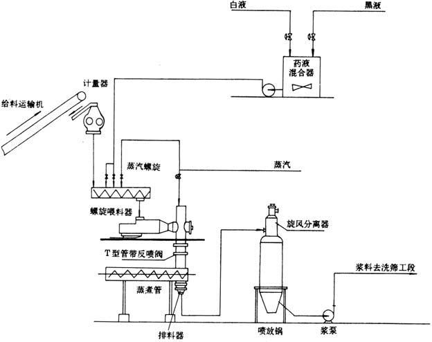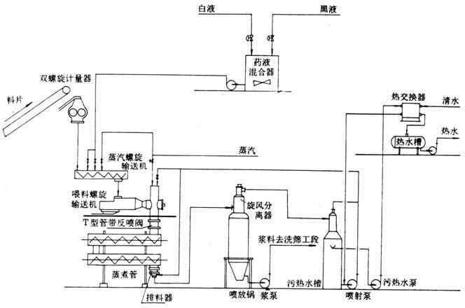 图5-4-7 立锅常规蒸煮流程 (4)横管式连续蒸煮流程 有单管单喷放、双管单喷放和双管双喷放等形式。 ①单管单喷放连蒸煮流程