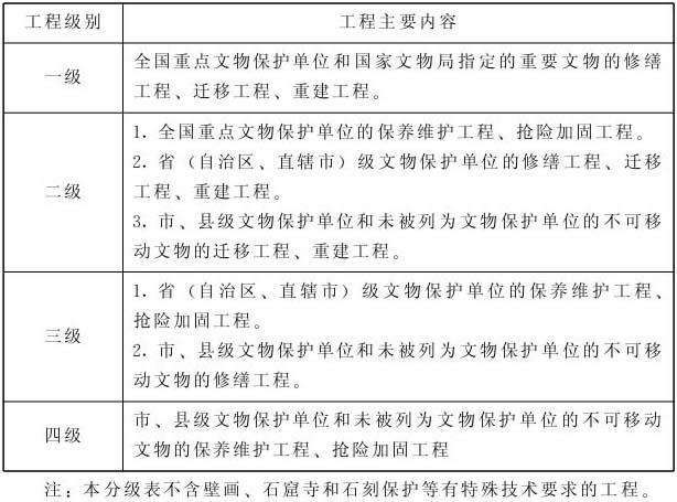 | 释义 | 文物保护工程施工资质管理办法(试行) 一 总 则 第一条 为加强文物保护工程施工单位资质管理,根据《文物保护工程管理办法》,结合文物保护工程的实际情况,制定本办法。 第二条 从事核定为文物保护单位和其它具有文物价值的古文化遗址、古墓葬、古建筑、石窟寺和石刻、近现代重要史迹及代表性建筑、壁画等文物保护工程施工单位的资质管理,适用本办法。 第三条 凡从事文物保护工程施工的单位,必须按照本办法申请并取得《文物保护工程施工资质证书》,方可承担相应等级、业务范围的工程。 第四条 国家文物局负责审定、颁发《文物保护工程施工资质证书》和资质年检工作。省、自治区、直辖市文物行政部门负责资质初审和日常管理工作。 施工资质申报、审定工作每三年一次;年检每年一次。 二 资质等级与标准 第五条 文物保护工程施工资质等级分为一、二、三级和暂定级。壁画、石窟寺和石刻保护等有特殊技术要求的施工资质单独核定。 第六条 一级资质标准: 一、经主管机关核准登记的法人单位,从事文物保护工程施工十年以上,独立承担过不少于五项、工程等级为一级,或者不少于十项、工程等级为二级以上的文物保护工程,质量合格。 二、法定代表人与技术人员均有较强的文物保护意识。单位总体水平在国内同行业领先,有较高的社会信誉。 三、技术负责人必须具有相关专业高级技术职称,从事文物保护工程施工管理十五年以上,取得国家文物保护工程施工职业资格证书。 取得国家文物保护工程施工职业资格证书的项目负责人不少于5人。 文物保护工程各专业工种技术人员齐备,且取得国家文物保护工程施工职业资格证书的不少于20人。 四、有健全的技术、经营管理制度和全面质量管理体系。对工程质量、进度、造价等能进行直接管理及有效的控制。 五、具有完备的文物保护工程所需的专业技术装备。 六、注册资金600万元以上。 第七条 二级资质标准: 一、经主管机关核准登记的法人单位,从事文物保护工程施工六年以上,独立承担过不少于五项、工程等级为二级,或者不少于十项、工程等级为三级以上的文物保护工程,质量合格。 二、法定代表人与技术人员均有较强的文物保护意识,企业总体水平在省(自治区、直辖市)内同行业领先,有较高的社会信誉。 三、技术负责人必须具有相关专业高级技术职称,从事文物保护工程施工管理十年以上,取得国家文物保护工程施工职业资格证书。 取得国家文物保护工程施工职业资格证书的项目负责人不少于5人。 文物保护工程各专业工种技术人员齐备,且取得国家文物保护工程施工职业资格证书的不少于15人。 四、有健全的技术、经营管理制度和全面质量管理体系。对工程质量、进度、造价等能进行直接管理及有效的控制。 五、具有完备的文物保护工程所需的专业技术装备。 六、注册资金400万元以上。 第八条 三级资质标准: 一、经主管机关核准登记的法人单位,从事文物保护工程施工三年以上,独立承担过不少于五项、工程等级为三级,或者不少于十项、工程等级为四级的文物保护工程项目,质量合格。 二、法定代表人与技术人员均有较强的文物保护意识。 三、技术负责人必须具有相关专业高级技术职称,从事文物保护工程施工管理五年以上,取得国家文物保护工程施工职业资格证书。 取得国家文物保护工程施工职业资格证书的项目负责人不少于3人。 文物保护工程各专业工种技术人员齐备,且取得国家文物保护工程施工职业资格证书的不少于10人。 四、有较健全的技术、经营、质量、档案、财务管理制度。对工程质量、进度、造价等能进行直接管理及有效的控制。 五、具有较完备的文物保护工程所需的专业技术装备。 六、注册资金200万元以上。 第九条 暂定级资质标准: 资质条件不低于三级。 第十条 壁画、石窟寺和石刻保护等有特殊技术要求的施工资质除应具备上述相应的资质条件以外,还应具有掌握相关特殊技术的专业人员和必要装备。 第十一条 申请国家文物保护工程施工职业资格证书的人员,必须从事文物保护工程施工五年以上,或具有大专以上学历、从事文物保护工程施工三年以上,并经培训、考核合格。 三 资质申请和审批 第十二条 申请《文物保护工程施工资质证书》的单位,须向所在地省、自治区、直辖市文物行政部门提出申请。省、自治区、直辖市文物行政部门初审、汇总后,报国家文物局审批。 第十三条 申请《文物保护工程施工资质证书》,须提供下列资料: 一、文物保护工程施工单位资质申请表; 二、主管机关颁发的单位法人证书或文件; 三、法定代表人简历、任职文件、身份证复印件; 四、技术负责人和项目负责人简历、任职文件、职业资格证书、职称证书、身份证复印件; 五、专业技术人员的职业资格证书、职称证书、学历证书、身份证复印件; 六、完成的具有代表性的文物保护工程合同及验收评估资料; 七、审批机关认为必须的其他相关证件、资料。 第十四条 文物保护工程施工单位取得正式资质并从事施工活动满三年后,可提出升级申请。 申请资质升级,除提供本规定第十三条所列资料外,还应提供下列资料: 一、原资质证书正、副本; 二、原资质历年财务决算年报表。 第十五条 新设立的文物保护工程施