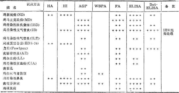 说明:①本表中所例举的试验方法都是常用的或很有推广价值的血清学检测技术,其中的英文名称分别代表:HA——血凝试验;HI-血凝抑制试验;AGP-琼扩试验;WBPA——全血平板凝集试验;FA——荧光抗体技术;ELISA——酶联免疫吸附试验;Dot-ELISA——斑点酶联免疫吸附试验。 ②表中的符号代表:++——用于诊断:++++——用于诊断与抗体水平的监测。 【判定标准】与阴性对照相同不呈现斑点者为阴性(-);以斑点深棕色,背景白色,对比度清晰为强阳性(++++);斑点浅棕色,对比度清晰为(++);介于两者之间为(+++);斑点较弱或点内有不均质的棕色点为(+)。 以出现阳性反应的血清最高稀释度为该血清的DotELISA效价。 (3)注意事项 ①本试验中NDV抗原、血清及酶标抗体的稀释度应根据预试验来确定。 ②本试验底物溶液中的供氢体是不溶性的DAB,根据斑点颜色也可选择其它供氢体,如4-氯-1-萘酚等。但绝不能使用可溶性供氢体。 ③根据试验的目的确定检测抗原或检测抗体。 ④封闭液既可使用异种动物血清,也可使用BSA或明胶进行封闭。应根据预试验选择最佳条件。 (4)应用 Dot-ELISA可进行常规ELISA所做的一切试验。应用方面参考实验5。 |