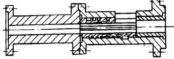 分段式料筒的结构见图2-31,由几个料筒段组合而成,各段用法兰或其它形式连接起来。所用材料同上。这种料筒的机加工比整体式料筒容易;便于改变长径比,多用于需要改变螺杆长径比或实验室用挤出机;更适用于有纵向沟槽的料筒和排气式挤出机料筒,使料筒的结构更加合理。其主要缺点是:分段太多时难以保证各段的对中,法兰连接处影响了料筒加热均匀性。