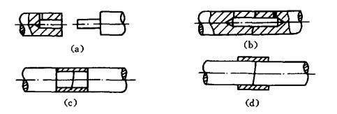 在各种机械设备中,轴是一种重要的零件,一般均为碳钢或合金钢圆杆,按传力情况可分为心轴和转轴两种.心轴仅作为旋转零件的支承而不传递动力,如定滑轮的轴、车轮的轴等.转轴则传递动力,如齿轮的轴、内燃机的曲轴等.由于轴均承受较大的负荷,因此在使用中经常发生断裂的情况.断轴的胶接修复可采用多种形式,如图8-8所示.图中,(a)为断轴可缩短或局部可更换的情况,将断轴一端车平并钻出胶接孔和排气孔,另一端车出台阶,然后进行胶接;(b)是将断轴两端各转一胶接孔并加工出排气孔,然后根据胶接孔配制一根心轴胶接在一起;(c)(d)是用加强套筒的方法进行胶接,(d)的加工简便,但受外形尺寸的限制.