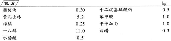 制法 按配比将水杨酸、苯甲酸研成细粉,过100目筛,备用。十二烷基硫酸钠与十八醇按处方量混合,置水浴中熔化,搅匀,冷后研成细粉备用。取凡士林、白蜡置容器中加热熔化,待130℃左右时搅拌下加入十二烷基硫酸钠与十八醇的混合细粉及平平加O及腊梅油,约至60℃时加入樟脑和水杨酸与苯甲酸的混合细粉,搅拌,待冷,即得成品。 |