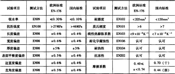 图16-3 劈离砖与砂浆的结合 1-砂浆;2-背面凹槽;3-劈离砖 劈离砖适用于各类建筑物的外墙装饰,也适用于车站、会议室、候车室、餐厅、楼堂馆所等室内地面的铺设。厚型劈离砖还适用于广场、公园、停车场、人行道、走廊等露天地面的铺设,也可用于游泳池底及池岸的饰面材料。 (二)彩胎砖 彩胎砖是一种本色无釉瓷质饰面砖,它采用彩色颗粒土原料混合配料,经压制成多彩坯体后,再经一次焙烧制成呈多彩细花纹的表面,富有天然花岗岩的纹点,有红、绿、黄、蓝、灰、棕等多种基色的制品。彩胎砖具有纹点细腻、质朴高雅、强度较高、吸水率小、耐磨性好等优点。 彩胎砖产品的主要规格有200mm×200mm,300mm×300mm,400mm×400mm,500mm×500mm,600mm×600mm等,其最小尺寸为98mm×98mm,最大尺寸为600mm×900mm。 彩胎砖表面有平面和浮雕型两种,又有无光、磨光和抛光之分。其主要技术质量要求为:抗折强度不小于27MPa,吸水率小于1%。这种产品的耐磨性极好,特别适用于人流密度大的商场、影剧院、宾馆、舞厅、酒楼等公共场所地面的铺贴,也可用于住宅厅堂墙地面的装饰。 (三)麻面砖 麻面砖是采用仿天然岩石色彩的原料作为配料,压制成表面凹凸不平的麻面坯体后,经一次烧制成炻质面砖。面砖的表面酷似经人工修凿过的天然岩石面,纹理自然,粗犷雅朴,有白、黄、红、灰、黑等多种色调。 麻面砖的主要规格有:200mm×100mm,200mm×75mm,100mm×100mm等。麻面砖具有吸水率小(<1%)、抗折强度高(>20MPa)、防滑耐磨等优点。 薄型麻面砖适用于建筑物外墙的装饰,厚型麻面砖适用于广场、停车场、码头、人行道等地面的铺设。作为广场用麻面砖,还有梯形和三角形,可用来拼贴成各种图案,以增加广场地坪的艺术感。 (四)玻化砖 玻化砖是坯料在1230℃以上的高温下,使砖中的熔融成分呈玻璃态,具有玻璃般的亮丽质感的一种新型高级铺地砖,在工程上也称为瓷质玻化砖。我国上海斯米克建筑陶瓷有限公司生产的斯米克玻化砖,是按照欧洲EN-176标准生产的,共有4大系列,100多个品种。如纯色系列、彩点系列、聚晶与梦幻系列、特殊用途的系列等,主要色系有白色、灰色、黑色、黄色、红色、绿色、蓝色、褐色等。主要规格有:200mm×200mm×20mm,300mm×300mm×30mm,400mm×400mm×40mm,500mm×500mm×50mm。 我国生产的斯米克玻化砖的主要特征有: 1.吸水率很低 斯米克玻化砖的吸水率很低,一般小于0.1%,比EN-176标准及天然石材还低5~30倍,长年使用,不变颜色,不留水迹,始终如新。 2.耐磨性能好 由于斯米克玻化砖经高温烧制而成,所以其质地密实坚硬,产品的莫氏硬度达到7,耐磨度为130mm3,仅为欧洲标准的64%(欧洲标准的为205mm3)。 3.抗折强度高 斯米克玻化砖的抗折强度很高,一般大于46MPa,施工中不易破损,使用中寿命较长,是一种高强度装饰材料。 4.耐酸碱腐蚀 斯米克玻化砖耐酸碱腐蚀能力强,对一般的酸碱不留污渍,易于清洗。 5.其他性能优 我国生产斯米克玻化砖是采用全电脑化设计和自动化检验设备,尺寸准确、形状规格,表面均匀平整,色泽协调一致。由于产品吸水率极低,表面未施任何釉料,所以摩擦系数较高,具有极好的防滑效果。此外,产品原料中不含对人体有害的放射性元素,是一种高品质的环保型建筑装饰材料。 由于我国生产的斯米克玻化砖技术性能优良,所以很快在很多工程中成功应用,如上海商务中心、上海新世界城、上海广播电视大楼、上海第一八佰伴新世界商厦、北京故宫博物院、外交部大楼、中央电视塔、钓鱼台酒店、国际饭店等工程铺地装饰。 表16-17为斯米克玻化砖的技术标准。 表16-17 斯米克玻化砖的技术标准