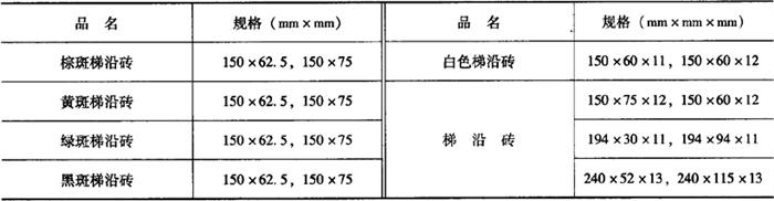 (五)陶瓷壁画 陶瓷壁画是现代建筑装饰艺术中,建筑师与艺术家二者有机结合的产品。陶瓷壁画是以陶瓷面砖、陶板等建筑装饰块材,经镶拼制作出具有较高艺术价值的建筑装饰,属于新型高档装饰。陶瓷壁画通过艺术的再创造,巧妙地融绘画与装饰艺术为一体,经过放样、样板、刻画、配釉、施釉、焙烧等一系列工艺,采用浸、点、涂、喷、填等多种施釉技术,创造出神形兼备、巧夺天工的艺术珍品。 我国在用陶瓷材料进行室内大型墙面装饰方面,具有独特的艺术和风格,已创造出许多着名的陶瓷壁画。如首都国际机场候机大厅里的“科学的春天”,是1979年中国瓷州艺术陶瓷厂和中央美术学院合作,设计和烧制成功的第一幅大型高温花釉陶板壁画;1984年10月,釉中彩“太行竹海”大型陶瓷壁画,是由江苏省陶瓷研究所研制成功的,整个壁画由756块方形瓷砖镶拼而成,总面积达200m2,画面毛竹粗壮挺拔、文雅清秀、青翠碧绿、光彩照人;“天文纵横”陶瓷壁画镶嵌在北京地铁建国门车站,是中央美术学院设计、中国瓷州艺术陶瓷厂烧制成功的,总面积达180m2,是迄今我国面积最大的高温花釉壁画;北京人民大会堂辽宁厅的彩陶壁画“满族风情”,长29.43m、宽4.6m,由2660块陶板拼贴而成,是辽宁室内装饰工程联合总公司、辽宁省画院、鲁迅美术学院、辽宁美术出版社等单位设计,宜昌市彩陶厂烧制,于1987年2月完成的。另外,我国还有“山间小路”、“丝绸之路”、“阳光、生命、大地”等陶瓷壁画优秀作品。 陶瓷壁画具有单块砖面积大、厚度薄、强度高、平整度好、吸水率小、耐腐蚀、抗冻性强、耐急冷急热、施工方便等优点,适用于宾馆、机场、酒楼、会客厅、候车室、会议室、地铁等公共设施的装饰。 (六)梯沿砖 梯沿砖坚固、耐磨,因其表面有凸起的条纹,所以具有很好的防滑性能,主要用于楼梯、站台等处作为防滑装饰材料,故又称“防滑条”。梯沿砖的颜色有红、绿、棕等。其品种、规格见表16-18。 表16-18 梯沿砖的常见规格