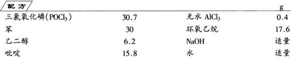 制法 在装有电动搅拌器、恒压漏斗和温度计的250ml四颈烧瓶中,按配比加入POCl3、苯,搅拌冷却下慢慢滴入乙二醇和吡啶的混合溶解,用冰水浴控制温度15~18℃,加料时间3.5h,加完后保温热化1h。加入无水Al℃l做催化剂,升温至60℃,慢慢通入配方量的环氧乙烷,1h后停止,在65℃保温1h,倒入100ml水中,用碱中和至pH=7。移入分液漏斗,用水洗涤3次,分去水层,所得产物用蒸馏法精制,先减压蒸出苯,再减压蒸馏出产物,得浅棕色透明液体42.48g,即为产品。收率90%,纯度97%。 |