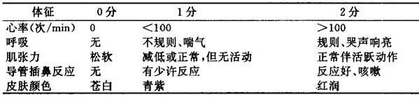 | 释义 | 新生儿窒息 新生儿窒息是指新生儿出生后无呼吸或呼吸断断续续达1min,但心跳仍然存在的现象。窒息的本质是缺氧,任何引起新生儿缺氧的因素均可导致新生儿窒息,包括母体(母妊高征、糖尿病、急性失血、慢性心、肺、肝、肾功能不全等);胎盘(前置、低置、早剥等);脐带(绕颈、打结、脱垂、过度扭转等);胎儿本身(Rh溶血、早产、过期产、先天畸形)等。窒息是引起新生儿死亡和导致智力障碍的主要原因。 【诊断】 1.胎内缺氧时的表现 (1)胎心增快,晚期则减慢至消失。 (2)胎动增加,晚期则减少至消失。 (3)羊水污染。 2.窒息标准 新生儿出生时窒息程度可按Apgar评分来判断,见表2.12.1。其中生后1min评分是判断新生儿是否有窒息的标准:8~10分基本正常;4~7分轻度窒息;0~3分重度窒息。生后5min的评分对判断预后尤为重要。 表2.12.1 Apgar评分表