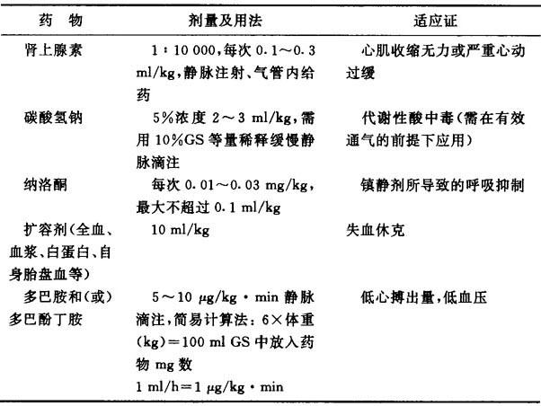 【治疗】 复苏的成败关系到新生儿的存活和预后。正确的复苏方法,即ABCDE复苏方案:A(Airway)保持呼吸道通畅;B(Breathing)建立呼吸;C(Circulation)建立正常循环;D(Drug)药物治疗;E(Evaluation)评价、监护。 1.保持呼吸道通畅 必须争取在新生儿第一口呼吸前立即挤净或吸除口、咽喉及鼻内的黏液。如羊水被胎粪污染很黏稠,则需在喉镜直视下将声门下及气管内的黏稠物吸出。 2.建立呼吸 (1)吸尽黏液后可给一般刺激和给氧,如轻拍小儿足底或摩擦背部,一般可引出自主呼吸。 (2)若仍无自主呼吸出现可采用气囊——面罩复苏器。注意选用大小合适的面罩,准确地置于婴儿面部,压力为1.96~3.43kPa(20~35cmH2O),频率为40次/min。 (3)若仍无自主呼吸,应予气管内插管,其指征为:有胎粪吸入需吸尽者;重度窒息需较长时间加压给氧人工呼吸者;应用气囊面罩复苏器仍无自主呼吸者;需气管内给药者;拟诊膈疝儿。气管插管加压给氧时,压力不要超过3.43kPa(35cmH2O),以防气胸,每分钟频率40次/min。 3.建立正常循环 正常循环最简单的评价是心率。缺气时心率减慢,一般吸氧或人工呼吸后心率即可好转。若经纯氧正压呼吸15~35s后心率仍低于60~80次/min,则应行胸外按压心脏。方法采用环抱法。抢救者双拇指并排或重叠于患儿胸骨体中下1/3交界处,进行按压,其他手指围绕胸廓托在背后。按压频率为120次/min,压下深度为1.5cm,按压3次,加压给氧1次。按压有效可扪及股动脉搏动。 4.用药 经气管插管加压给氧和胸外心脏按压后仍无反应者需用药。原则上心率减慢时用肾上腺素;血容量不足时予扩容;有酸中毒时用碳酸氢钠;如母亲用过麻醉药而小儿出生后呼吸抑制的用纳洛酮。 新生儿复苏常用药,见表2.12.2。 表2.12.2 新生儿复苏常用药物