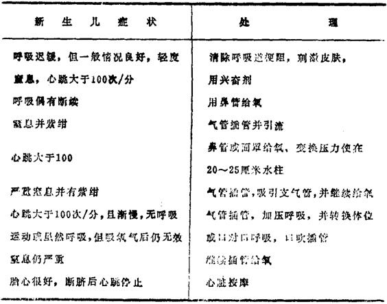 | 释义 | 新生儿窒息 【病因】 产生新生儿窒息的原因是缺氧。 一、母方:心血管功能障碍、贫血、多胎次、高年初产妇(34岁以上)、糖尿病及糖尿病期前的母亲、宫内感染、不明原因的宫内出血、骨盆狭小及胎位不正等。 二、胎盘:胎盘发育不良、栓塞、妊娠中毒症所致的胎盘血管内皮渗透性的改变、葡萄胎、前置胎盘、胎盘早剥、分娩缓慢等。 三、脐带:扭转、打结、臀位产脐带受挤压或破裂。 四、胎儿呼吸中枢:因功能不好而产生低氧血症、阵发性紫绀、颅内出血、核黄疸等。 五、呼吸道机械性梗阻:呼吸道及肺受到挤压、呼吸道及肺畸形,如膈疝及喉蹼等。 六、肺泡表面障碍:不成熟的水肿、肺透明膜综合征、肺出血、羊水吸入性肺炎。 七、贫血:失血或溶血而造成贫血。 【临床表现】 一、胎内缺氧窒息:胎动突然增加,然后减少或停止。胎心先快后慢,快于160次/分或慢于100次/分均为胎内窒息预兆,应及早结束分娩,以免继续造成脑的损伤。 二、分娩后窒息:由于缺氧及二氧化碳瘀积抑制了呼吸中枢,出现呼吸浅表、微弱、不规律、呻吟、叹息,直至呼吸停止。血压开始时上升,以后随即下降。心肌受累,心功能衰竭,皮肤由红变青紫或苍白。神经系统开始时抑制,之后又兴奋。小儿睁眼凝视,肌张力开始时松弛,之后又增强,手足震颤或痉挛。晚期则有脑水肿颅内压增高。在缺氧情况下,易有恶心、呕吐。全身酶系受损,可有胎便瘀积及黄疸加重、小便梗阻或蛋白尿、管型尿或轻度血尿等。窒息超过6~12小时即可有酸中毒及高血钾症等。 【诊断与鉴别诊断】 根据呼吸障碍特点,不难诊断。但应注意与下列疾病相鉴别: 一、颅内出血及脑部产伤(详见前节)。 二、原发性肺不张,系极度不成熟或吸入大量羊水、胎便所致,故出生后没有建立过正常呼吸。 三、肺透明膜综合征:大部都在有过1~3小时呼吸以后,再出现逐步加重的呼吸困难。易发生在胎龄小的未成熟儿、糖尿病者所生的小儿、有宫内感染的小儿,正常新生儿偶有发生。胸部X线检查有颗粒状最后呈网状至毛玻璃状的阴影。可用药物喷雾吸入,药品可用α-糜蛋白酶、乙酰半胱胺酸或胞浆素等,以溶解呼吸道梗塞物。 【治疗】 一、窒息时的治疗:应首先复苏。 各种复苏方法表
