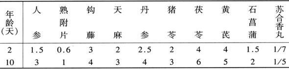 【歌诀】 参蝎汤用麻蝉黄,朱砂天浆与麝香。 本方宋代治胎惊,今日用来治脑病。 〔按语〕本方由原方减朱砂(含汞)、天浆子、麝香,加芪、茯、钩、芎、红组成。方中人参作用同上方钩藤散加减。全蝎熄风解痉、解毒散结,并有较强的抗惊厥作用。该药研末吞服功用较佳,但不入煎时,表中剂量减半。天麻熄肝风、定惊搐。蝉蜕作用同前方,该药能降低横纹肌紧张度,能对抗马钱子、烟碱等引起的惊厥死亡。天竺黄凉心定惊。方中加用芪、丹、芎、红益气养血、活血化瘀。黄芪尚有良好的清除自由基作用;川芎、红花具有抗氧化、抗脑水肿作用。钩藤、茯苓的作用同上方钩藤散按语。钩藤配蝉蜕,作用协同。全方益气活血,安心平肝,熄风定惊。若患儿抽搐重者,可重用全蝎或再加白僵蚕、地龙。前囟肿者,还可加猪苓、白茅根。对意识迟钝者,可按原方加用麝香。 (三)瘀血阻窍,元气败脱 见于本病重度患儿,可称重度胎惊。本型肯定要有明显的缺氧缺血病史。 〔证候〕生后昏睡或呈昏迷状,面色青白,口鼻气冷,手足不温,肢体松软,惊风频发,喉间痰鸣。呼吸浅、慢或暂停,前囟肿。舌质淡白或紫暗。指纹青紫黑,可达命关或透关射甲。 〔治法〕开窍定惊,回阳救逆。 〔方药〕苏合香丸与参附汤加味。