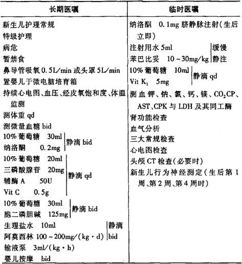 说明:1.一般第1天禁食,第2天试喂糖水,第3天喂2∶1稀释奶,此后无异常则改全奶喂养。 2.纳洛酮一般用于中、重度患儿,疗程5天。 3.出生后3天内,液量摄入控制在60~80ml/(kg·d)。 4.对有代谢性酸中毒者,应予纠正酸中毒: 5%碳酸氢钠(ml)=-BE×体重x0.5先给1/2~2/3量。若无血气分析可按5%碳酸氢钠3~5ml/(kg·次),加双倍注射用水稀释成接近等张液(1.4%碳酸氢钠)。 5.对有血压下降、心率减慢者,则用10%葡萄糖液加多巴胺、多巴酚丁胺2~10μg/(kg·min)静滴。用药计算:体重×3+10%葡萄糖50ml,则5ml/h=5μg/(kg·min)。 6.脑水肿者,用呋塞米1mg/(kg·次)bid;20%甘露醇0.25~0.5g/(kg·次),q4~8h一次,时间不超过5天。注意水、电解质紊乱。 7.出现惊厥者,苯巴比妥钠20~30mg/kg负荷量静注,12小时后改5mg/(kg·d)肌注或静注4~5天。 8.有呕吐者,予温生理盐水50ml洗胃;若呕吐物为咖啡样,则用冷生理盐水洗胃,洗后注入西咪替丁0.1g。 9.疑有颅内出血者,若病情允许,尽早行头颅CT检查,其他病人一般14天后做。加用酚磺乙胺0.125g,静滴bid。 10.高压氧治疗。 11.指导家长行早期干预治疗,新生儿专科门诊随诊,新生儿行为神经测定(NBNA),婴幼儿智能发育测定(CDCC)。 |