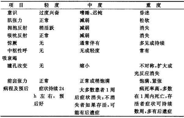 | 释义 | 新生儿缺氧缺血性脑病 缺氧缺血性脑病是新生儿因缺血缺氧引起的脑部病变。其主要病因是围产期窒息。重者可产生永久性神经功能障碍,如智力低下、癫痫、脑瘫等。 【诊断】 1.临床表现 症状和体征: (1)有明确的围产期缺氧史 出生时重度窒息(Apgar评分1min<3分,5min<6分,经抢救10min后才有自主呼吸或需用气管插管正压呼吸2min以上者)。 (2)生后12h内出现神经系统症状,如意识障碍、肌张力及神经反射异常、惊厥等,重症出现中枢性呼吸衰竭等。 (3)缺氧缺血性脑病的临床分度 见表2.12.4。 表2.12.4 新生儿缺氧缺血性脑病的临床分度