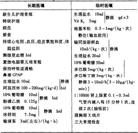 7.鼻塞CPAP压力6~8cmH2O(早期或怀疑有肺出血者),对已有口鼻出血或病变广泛者应使用呼吸机,首次调参数:FiO2 60%~80%,PIP 25~30cmH2O,PEEP 5~7cmH2O,呼吸每分钟40次,I∶E=1∶1.5。