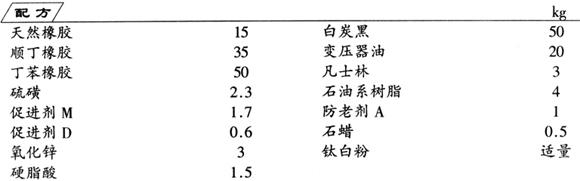 先将天然、顺丁、丁苯三种橡胶和二种促进剂M、D混合,进行塑炼,再加入其余全部组分进行混炼,薄通,得到胶料。按旅游鞋底加工工艺成型,经硫化,制成鞋底。