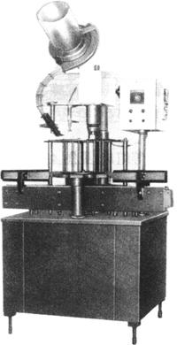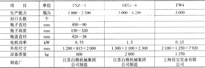 图4-7-8 旋合封口机 工作时,瓶子由输送链送入分瓶螺旋机构,然后将瓶子等距送到拧盖机构及立轴的工作台处,抱手机构将瓶子抱住,与此同时拧盖机构压住瓶盖,顺时针旋转,使盖拧紧,再由输瓶链条送出,完成拧盖操作。 (三)主要技术参数(表4-7-1) 表4-7-1 旋合封口机主要技术参数