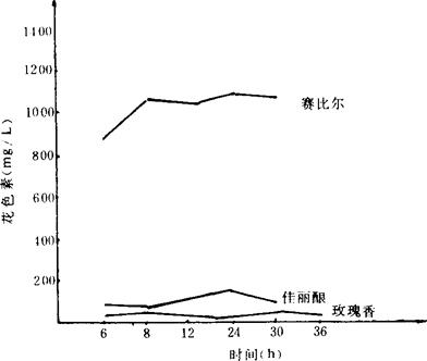 (二)工艺说明 1.葡萄破碎后,输入罐中,在罐内进行密闭、控温、隔氧并保持一定压力的条件下,浸提葡萄皮上的色素物质和芳香物质,当诱起发酵、色素物质含量不再增加时,即可进行分离皮渣,将果汁输入至另外发酵罐中进行纯汁发酵。 2.旋转罐转动方式正反交替,每次旋转5min,转速为5r/min,间隔25min。 3.以葡萄浆中花色素的含量不再增加作为排罐压榨的依据。不同葡萄品种花色素在旋转罐中浸渍曲线如图3-3-10所示。