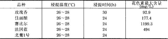 图3-3-10 不同葡萄品种的花色素含量 不同葡萄品种在罐内浸提时间不同,花色素含量不同,延长浸提时间不一定能增加花色素含量。 葡萄浆在旋转罐中花色素的浸提程度与浸提的时间、温度有关。经实验认为,不同品种的花色素含量达到最大值,浸提温度和浸提时间不同。不同品种最佳浸提温度和最佳浸提时间详见表3-3-22。 表3-3-22 不同品种的浸提温度浸提时间