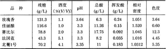 注:表列数据系1984年北京酿酒总厂、北京葡萄酒厂试验组分析。 表3-3-27 不同品种两种发酵方法生产的红葡萄酒感官品评