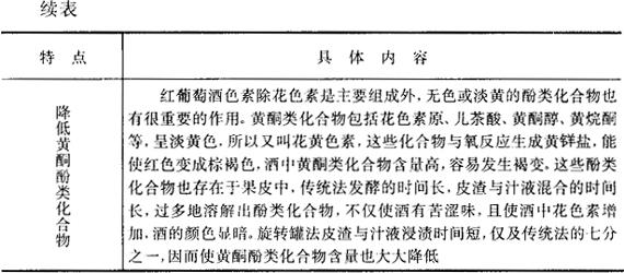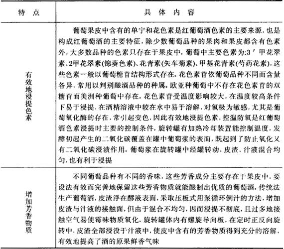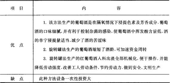 (三)旋转罐法的工艺特点 旋转罐法生产红葡萄酒是在总结传统生产方法存在的缺点、特别是在酒的质量上存在缺点的基础上而研制的一种新方法,对提高红葡萄酒的质量具有如下特点(见表3-3-24)。 表3-3-24 旋转罐法生产红葡萄酒的特点